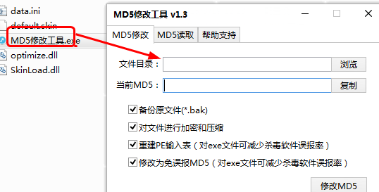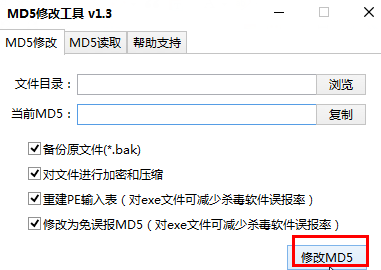每一个文件都具有一个唯一的MD5(又译摘要算法、哈希算法),就好比每个人拥有独一无二的身份证。随着互联网发展,软件安全问题也备受考验。本工具可快速修改文件的MD5防止误报,并内置了文件压缩加密等功能,可有效减少文件的大小,并降低被杀软报毒的概率(误报率)。