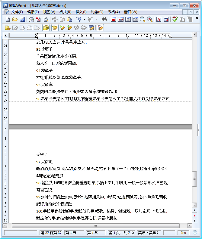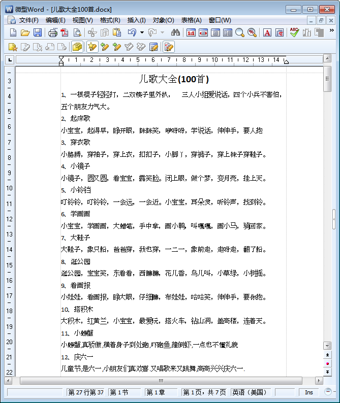 这是一份word文字版宝宝儿歌大全——也就是不少朋友正在寻找的儿歌大全100首。既然小编都说了这是“儿歌大全100首打包下载”文档了,所以在你下载这份文档之后你自然就会看到一份由100首儿歌组成的word文档啦!真材实料,绝不坑爹!要教宝宝学儿歌的朋友们切莫错过了这份文字版100首儿歌大全哦!等等,你问东坡小编怎么下载该文档?点击本文相应的下载地址进行下载就可以啦!