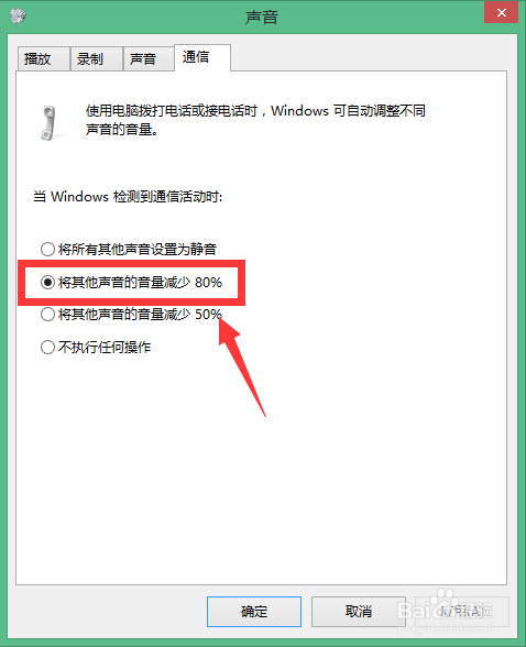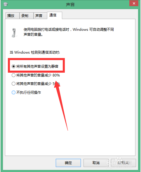 4、在”通信控制面板“,将当windows检测到通信活动时,该设置由”其他声音减少80%“更改为”其他声音设置为静音“,并点击”应用“,如图