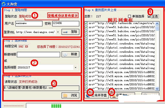 3、经过以上步骤后,数据包里包含的图片已上传到大淘营相册,您的数据包CSV文件(即原来的CSV文件,搬家工具不会产生新CSV文件,是直接修改CSV文件)中的图片地址也更新成了新的地址,下面要做的是: