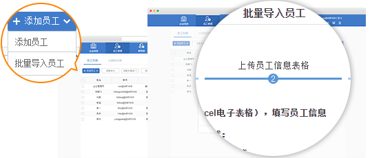 后台完善"企业信息",点击顶部"员工管理"添加或导入公司员工信息;
