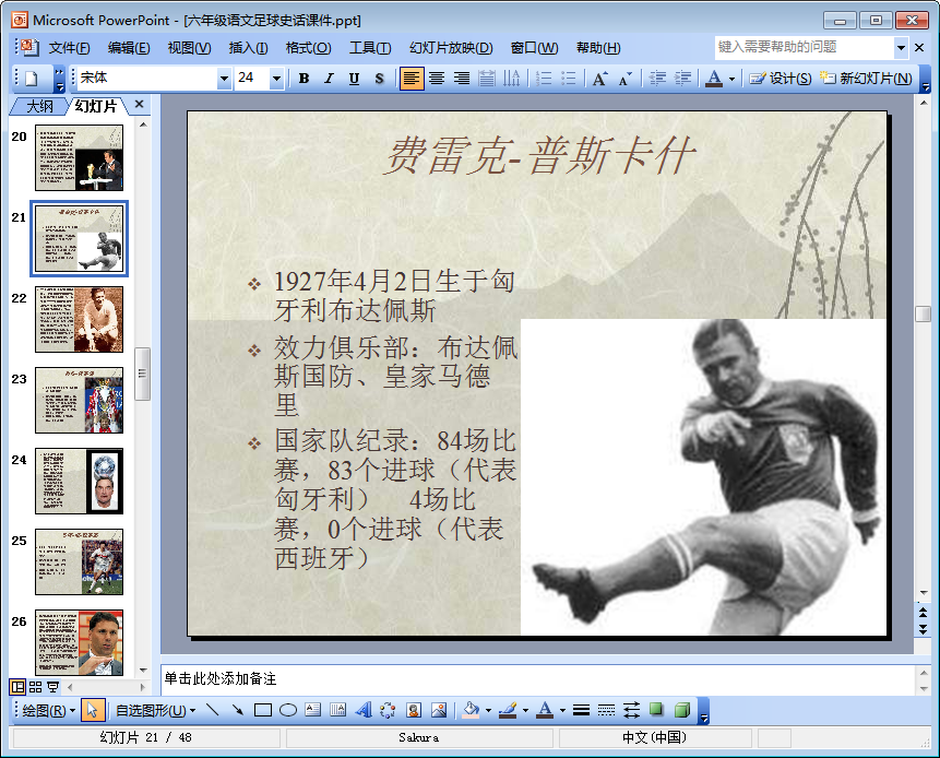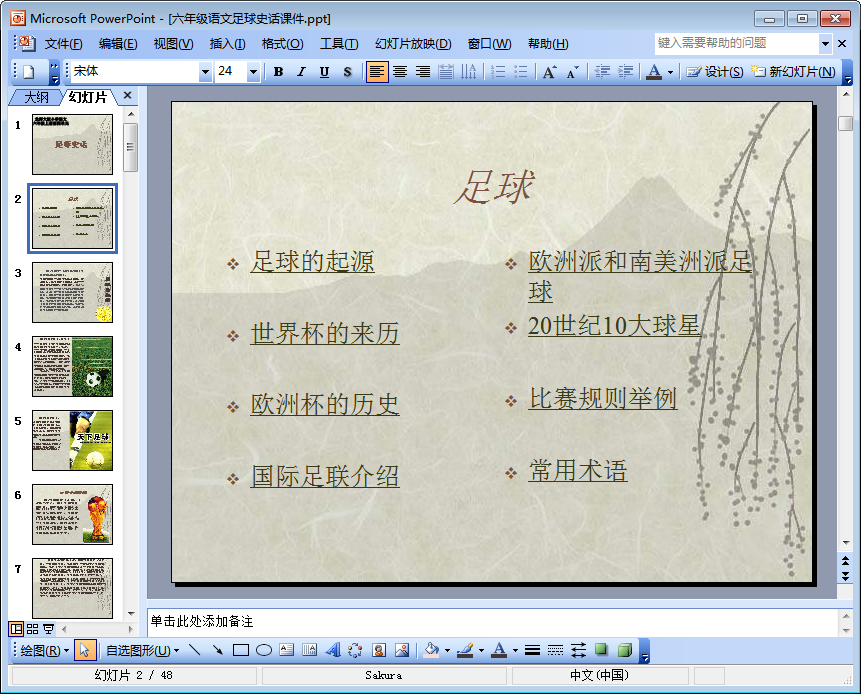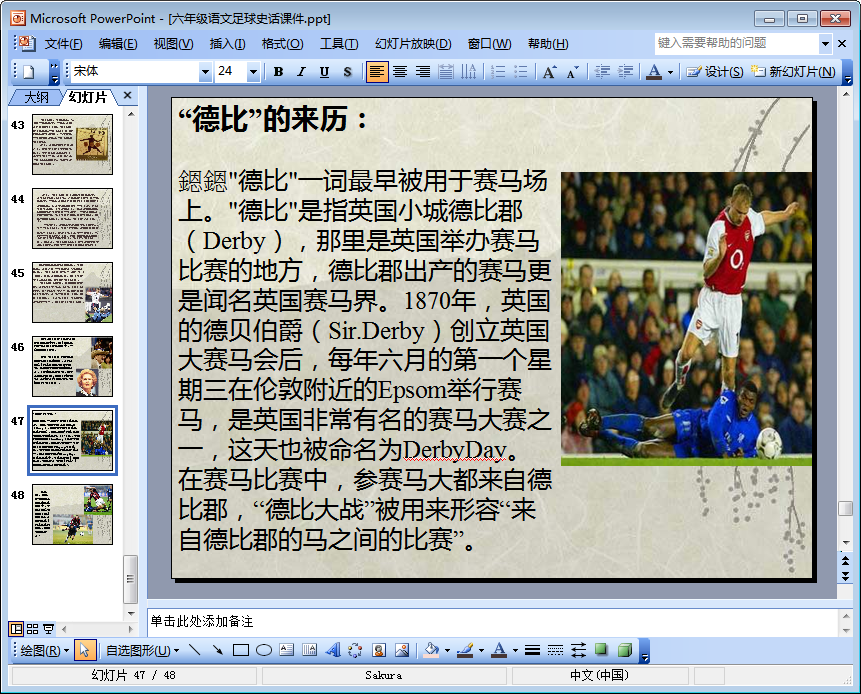足球史话是北师大版小学语文六年级上册第四单元中课文之一。点击本文相应的下载地址进行下载后你将会获得一份免费由48页组成的足球史话ppt课件,该ppt内容十分详细,便于老师引导学生深入理解课文,如果你需要一份足球史话ppt课件的话,那就赶紧来下载吧!