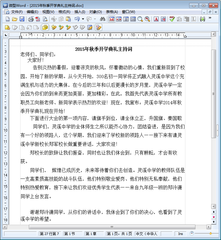 告别炎热的暑假,迎着凉爽的秋风,怀着激动的心情,我们重新回到了校园,开始了新的学期。从今天开始,300名初一同学将正式融入灵溪中学这个充满生机与活力的大集体,在今后的三年和以后更漫长的岁月里,灵溪中学一定会因为你们的到来而更加美丽,更加精彩。在此,我首先代表灵溪中学所有教职员工向新老师、新同学表示热烈的欢迎!现在,我宣布:灵溪中学2014年秋季开学典礼现在开始!