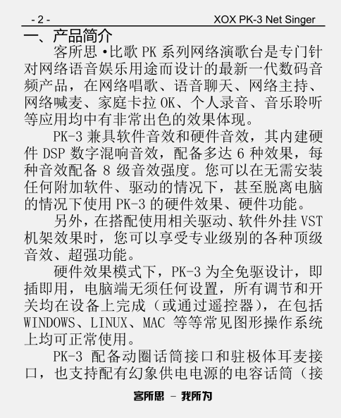 在本节内容中东坡小编和大家分享的是一份pdf格式高清电子版客所思·比歌PK-3网络演歌台使用手册(以下简称为客所思pk3说明书),该说明书共有27页,内容完整详细且图文并茂,其中详细介绍了客所思PK-3网络演歌台的使用方法及使用注意事项等,想对客所思PK-3网络演歌台有更多了解的朋友们赶紧来下载查阅这份客所思pk3说明书吧!