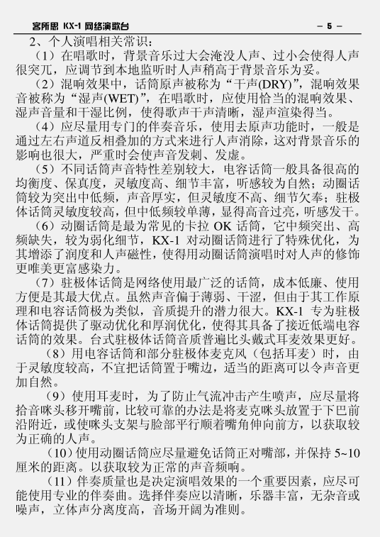 (6)动圈话筒是最为常见的卡拉 OK 话筒,它中频突出、高频缺失,较为弱化细节,KX-1 对动圈话筒进行了特殊优化,为其增添了润度和人声磁性, 使得用动圈话筒演唱时对人声的修饰更唯美更富感染力。