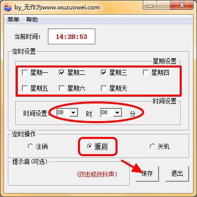 然后设置时间,选择“重启”,点击【保存】按钮,然后就让电脑挂着,到时间后就会实现自动重启的功能