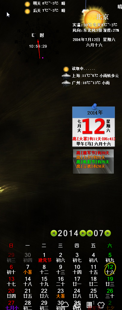 星语桌面天气日历是一个双重工具,它既是一个日历工具,也是一个天气工具,有了它你看天气看日历两不误,非常方便实用,是你桌面必不可少的工具。默认天气日历位置在左上角;如果您不喜欢这个位置,可以用鼠标拖动位置到你合适的位置,支持所有屏幕比例,无需担心设置问题;第一次使用请先设置你的地域,设定墙纸可不设置(可以解决您更换后墙纸设置的问题);如果您要设置墙纸,请在[设定墙纸]前点上,然后选择您系统默认的墙纸;或者您要自定的请在[自定]前点上,然后浏览你的墙纸即可;支持[日历][星期][农历][节日]独立显示;字体大小与颜色请按你的墙纸类型设置,此可省略。