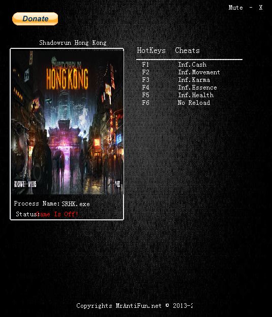 暗影狂奔:香港修改器六项3.0.3,MrAntiFun制作,游戏第一个修改器,有无限生命、无需装弹等功能,在别人还在痛苦挣扎的时候你就可以洗衣纵横了,适用于3.0.3版本。