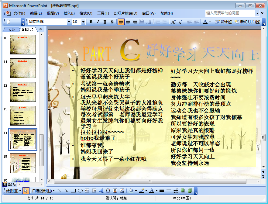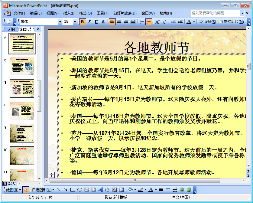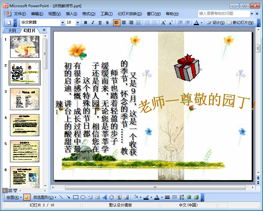 2015年的教师节就要来了,如果你还没有想好要送什么礼物给你最亲最爱的老师的话,不如和你的同学们商量一下,一起为你的老师们庆祝一下这个教师节吧!本节内容东坡小编为大家整理带来的是一份由16页组成的中学庆祝教师节主题班会课件,希望这份教师节主题班会ppt能为你带来帮助和启发!