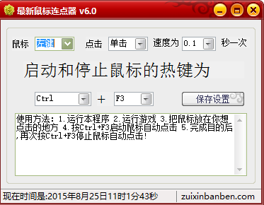 最新鼠标连点器是一款非常实用的鼠标连点器。自动点击鼠标左键或右键。可以帮助你提高办事效率。十分强大。有需要的可以来东坡下载使用!