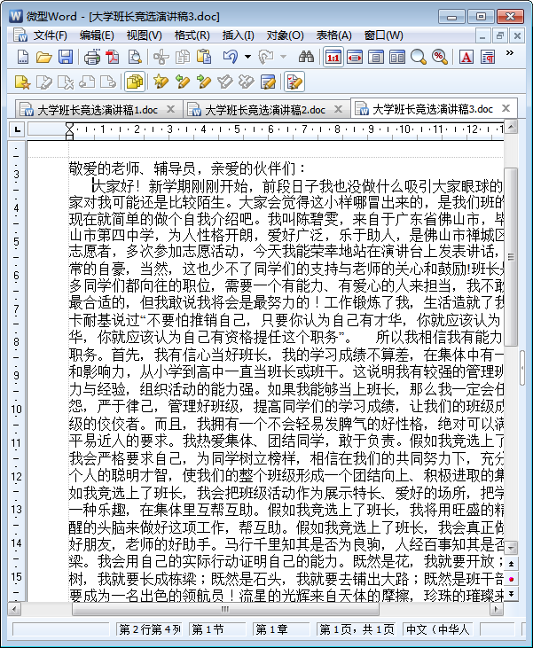 大家好!新学期刚刚开始,前段日子我也没做什么吸引大家眼球的地方,大家对我可能还是比较陌生。大家会觉得这小样哪冒出来的,是我们班的吗?我现在就简单的做个自我介绍吧。我叫陈碧雯,来自于广东省佛山市,毕业于佛山市第四中学,为人性格开朗,爱好广泛,乐于助人,是佛山市禅城区的注册志愿者,多次参加志愿活动,今天我能荣幸地站在演讲台上发表讲话,感到非常的自豪,当然,这也少不了同学们的支持与老师的关心和鼓励!班长是一个许多同学们都向往的职位,需要一个有能力、有爱心的人来担当,我不敢说我是最合适的,但我敢说我将会是最努力的!工作锻炼了我,生活造就了我。戴尔卡耐基说过“不要怕推销自己,只要你认为自己有才华,你就应该认为自己有才华,你就应该认为自己有资格提任这个职务”。 所以我相信我有能力担任这一职务。首先,我有信心当好班长,我的学习成绩不算差,在集体中有一定威信和影响力,从小学到高中一直当班长或班干。