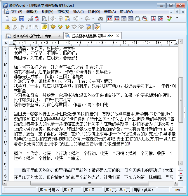 开学啦!要办一期与新学期、开学有关的黑板报,可是写来写去、画来画去,那张黑板还是显得有点空洞——说白了就是内容不够啊!怎么办?当然是找一些可以作为新学期黑板报资料使用的文字素材啦!本节内容东坡小编为大家整理带来的便是这样一份素材——开学黑板报内容资料合集,doc格式word版文字资料两份,外加一份txt格式新学期黑板报资料,有需要的朋友千万不要错过哦!