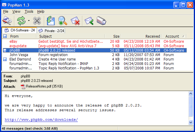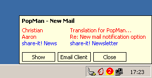 你可以拥有PopMan在后台运行,定期检查你的账户。 新邮件到达时,您将立即通知。