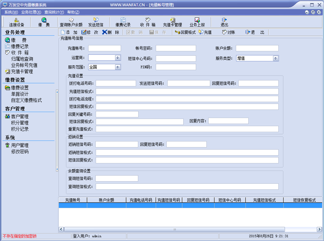 万发空中充值缴费系统是指代理商利用移动手机账户间的转账操作为客户进行话费充值或缴费的充值业务。简而言之,就是使用一部手机的帐户为另外一部移动手机进行缴费。代理商可在为客户代理充值过程中获取相应的酬金回报。“空中充”业务特约代理商通过向当地移动公司申办,待审批后,可获得一个代理商帐户,代理商预存一定金额后,即可使用该手机号码对应的帐户为客户进行话费充值或缴费。代理商可采用短信、语音或空中充客户端软件中的任意一种方式为移动客户进行充值缴费的操作。缴费金额从代理商帐户中扣减后,转入到客户的手机帐户中。代理商可到开通空中充业务的当地移动营业厅进行办理,开通空中充代理业务。办理空中充业务有三种方式:1.使用短信给移动用户进行充值 2.拨打语音电话根据提示给移动用户充值 3.使用安装空中充客户端软件,通过操作软件的方式给用户充值。