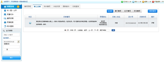 1. 村(社区)管理员登录后台,点击“网上反映”,即可查看网上反映事项列表。2.点击“详情”,查看反映事项具体情况。