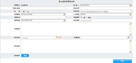 2.村(社区)干部下村走访时,记录下群众反映事项,本级能办理的当即办理,经村(社区)书记、主任确认属于受理范围且本级无法办理的,则进入系统录入相关信息。带*号必填。