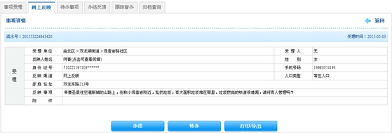 3.村(社区)管理员将该事项打印后上报主要领导,确认是否受理。经领导审签,如本村(社区)可办结的,点击“办结”,录入办结情况点击“提交”;如本村(社区)无法办结的,点“转办”,录入转办意见后将该事项转交所在乡镇(街道)办理。如反映事项属无效内容,则不予受理,点“办结”后,点选“不予受理”,录入不受理原因。
