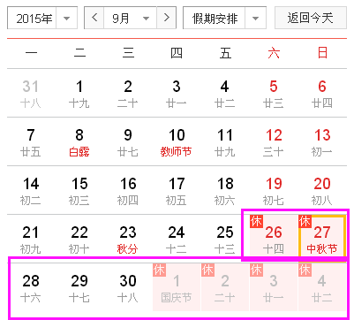 2015年的中秋节跟十一国庆节其实是连着的,9月27日就是中秋节,26日刚好是周六,所以从26一直休假到10月7日的话,那么就可以休假12天,需要请假3天,请假的时间分别是28,29,,30这三天。
