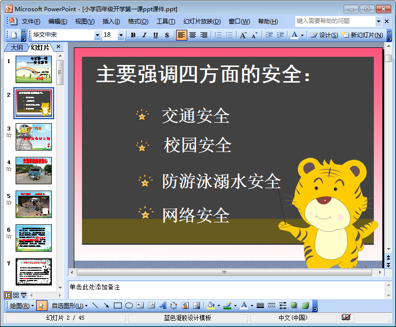 有朋友给小编留言说在东坡下载站竟然没看到小学四年级开学第一课ppt课件——于是一向能积极听取批评和建议的东坡小编便以迅雷不及掩耳盗铃之势速度为大家整理带来了这份由45页组成的小学四年级开学第一课ppt课件——该四年级开学第一课ppt主要强调的是“安全”二字,有需要的朋友点击本文相应的下载地址即可查阅该小学开学第一课ppt的全部内容哦!