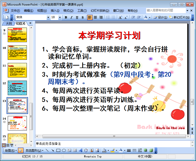 该七年级英语开学第一课课件(又可以称为初一英语开学第一课课件,以下简称为初一英语第一课ppt)共15页,内容完全免费,该ppt对整个初一年级的英语学习作了一个简单但又不失详细的介绍和说明,如果你需要这份初一英语第一课ppt的话,点击本文相应的下载地址进行下载即可!