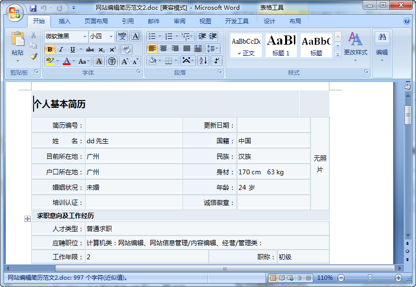 第一部分,个人基本信息(姓名、年龄、文化、专长、婚否、家庭等等,千万别忘了联系方式)