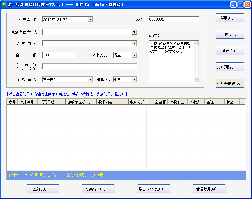 石子统一收款收据打印软件是一款针对“收款收据”进行打印的软件,该打印软件能够很好的收据单统一打印,使用起来方便快捷,无需安装的绿色打印工具,收据上的打印要素为开票日期、单号、缴款单位或个人,款项内容、收款方式、人民币大小写、收款单位盖章、收款人签章、备注等。