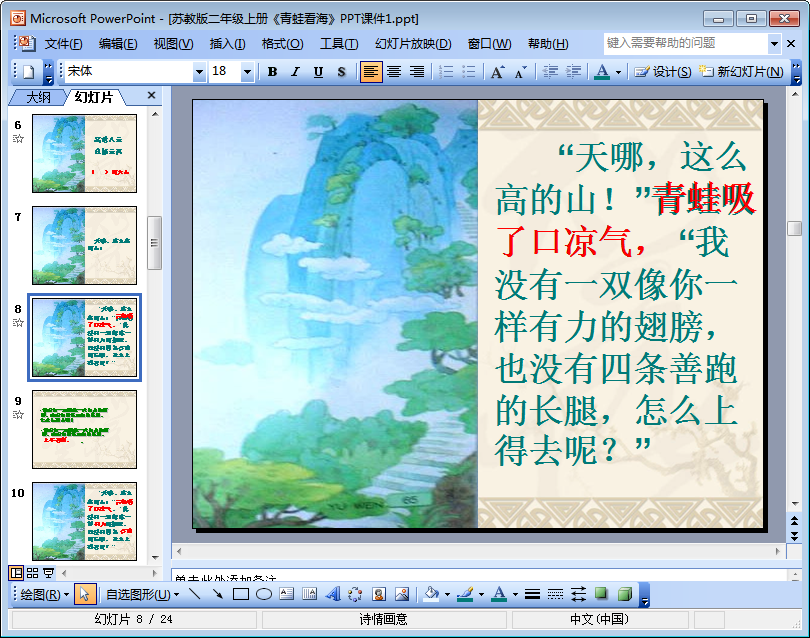 “天哪,这么高的山!”青蛙吸了口凉气, “我没有一双像你一样的翅膀,也没有四条的长腿,怎么上得去呢?”