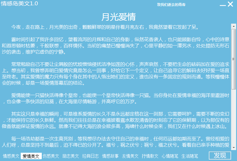情感岛美文是一款免费好用的电脑美文文章阅读软件,也是国内首款电脑美文文章阅读软件。作为行业新秀,情感岛更注重用户体验和创新!您可以在这里轻松的阅读文学内容,例如情感美文、经典日志、生活随笔等文学内容都可以在这里看到。更多好美文等你“发现”。