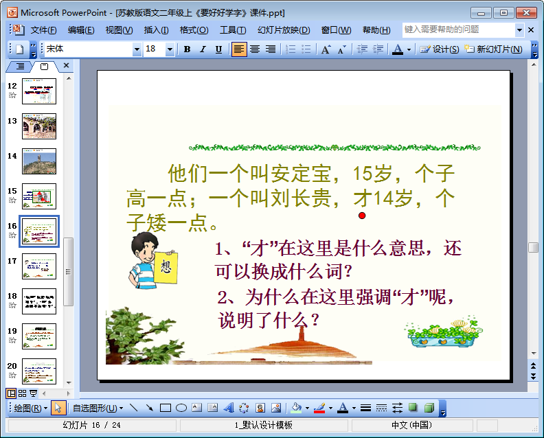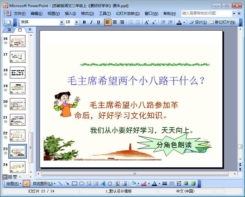 该苏教版语文二年级上册课件之要好好学字课文ppt共由24页组成,内容包括课文背景资料介绍,生字词详细解读以及课文重难点讲解等,如果你需要这份内容免费、共24页组成的要好好学字课文ppt课件的话,那就赶紧来东坡下载吧!