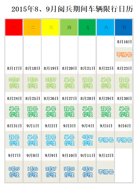 相信9月3日上午北京将举办世界反法西斯战争胜利70周年阅兵的事大家都知道了吧?当然,相信不少朋友也听说了在此期间北京将实行单双号限行的事了吧?那么这单双号限行具体是如何来实施的呢?本节内容东坡小编为大家整理带来的是一份excel免费版2015年8月到9月阅兵期间车辆限行的日历(简称2015北京阅兵限行时间表),方便诸位查询使用。有需要的朋友们快点击本文相应的下载地址将这份北京车辆限行时间表收好备用吧!