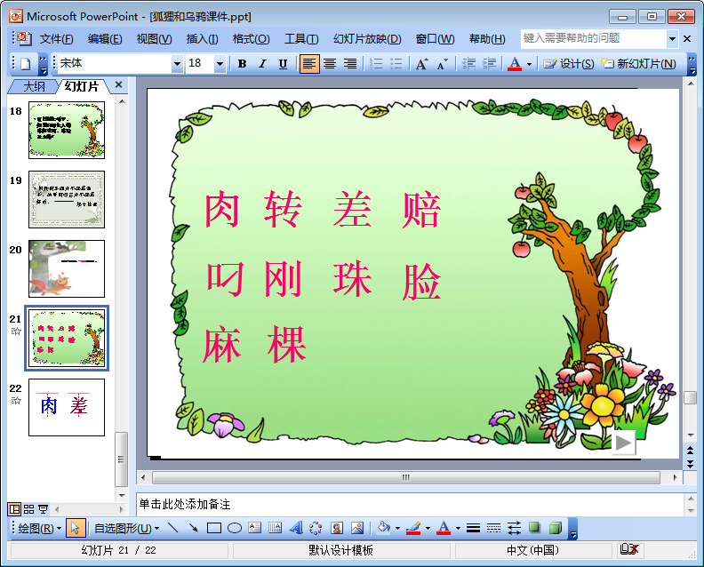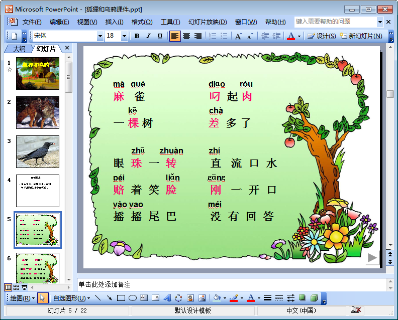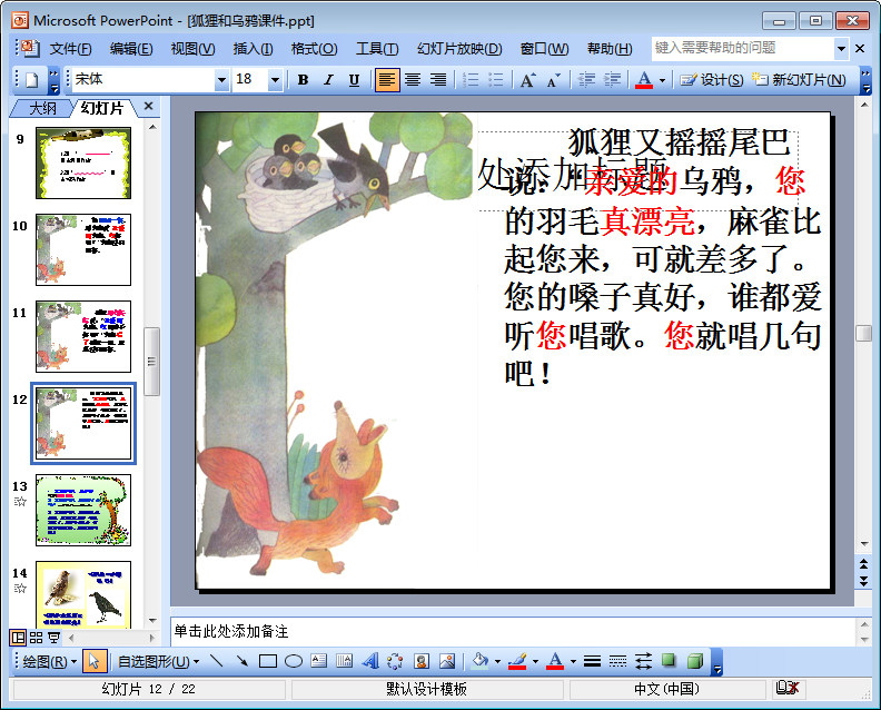 狐狸和乌鸦是一篇寓言故事,它也是一篇经常出现在小学语文课本中的一篇课文。本节内容东坡小编为大家整理带来的是苏教版小学二年级语文上册狐狸和乌鸦PPT课件,供有需要的教师朋友们进行选取使用,该狐狸和乌鸦ppt课件内容免费,共由22页组成,欢迎有需要的朋友们前来下载!