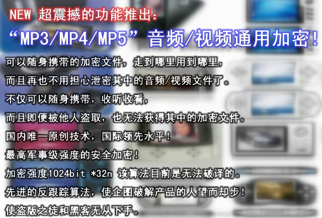 * 中国第一款MP3\MP4\MP5\手机加密授权播放的软件。