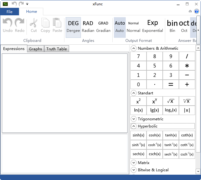 计算器使我们能够创建不同类型的表达式,包括三角函数,双曲线,矩阵,按位,常数,在右侧窗格中作出相应选择编程表达式。我们可以选择在用户界面,这就是我们也可以选择我们想要的答案的基础上,无论是十进制,十六进制,octadecimal或二进制格式除了选择角度测量顶部的功能区菜单上的表达参数。我们还可以创建真值表,逻辑表达式和相对容易的图表。