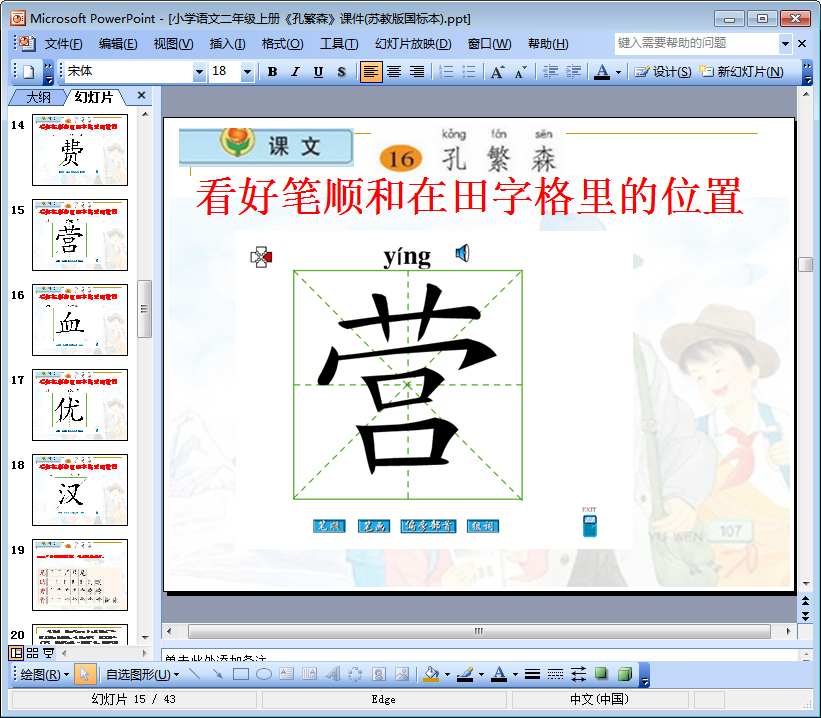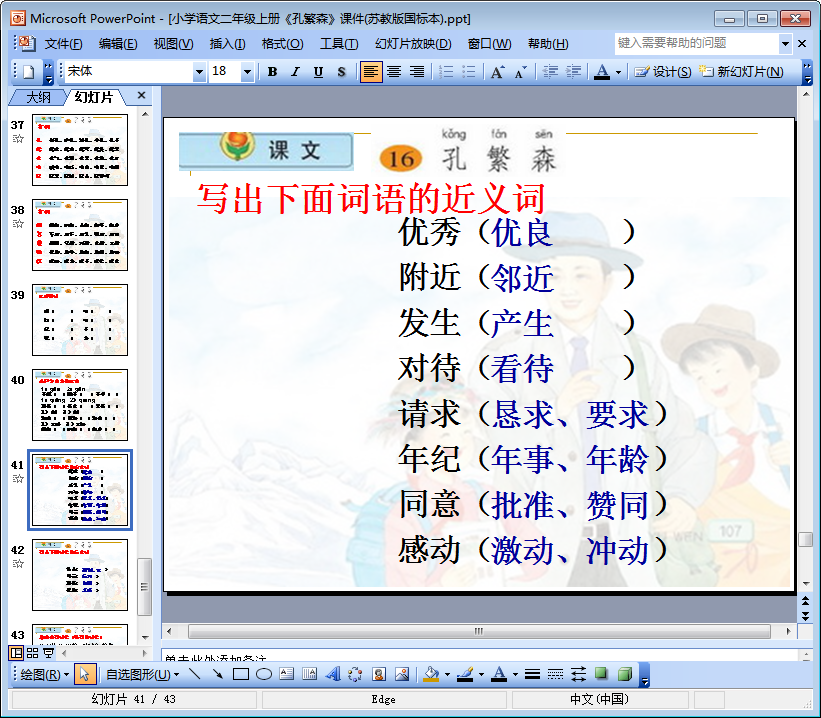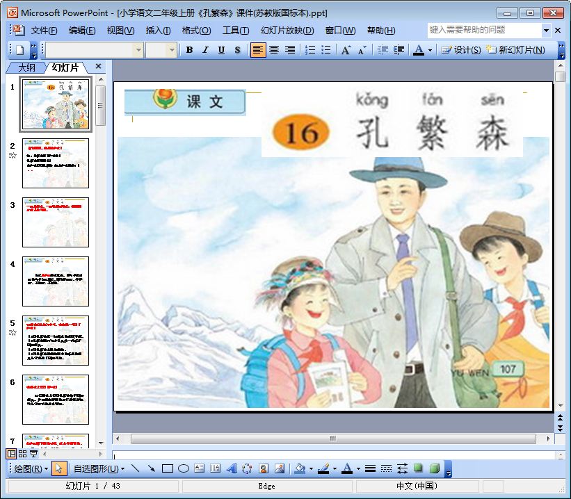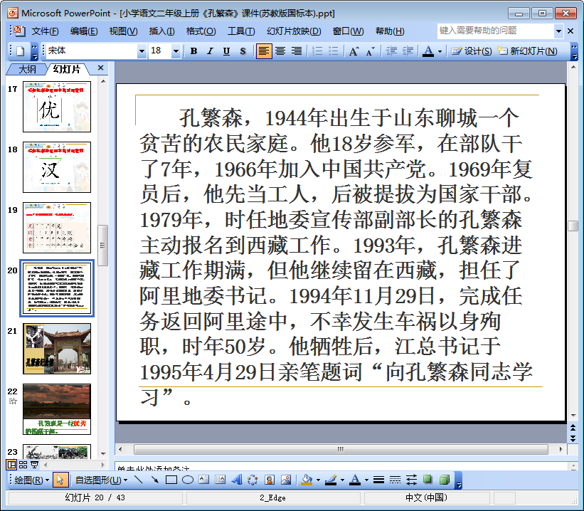 该苏教版二年级上册孔繁森课文课件ppt共由43页组成,是一份内容十分全面且详细的ppt课件。该课件包括课文背景介绍、重难点词汇介绍、以及课文重难点介绍等,下文有关于该课件的内容节选及预览图,如果你需要这份孔繁森ppt课件的话,只需轻轻点击本文相应的下载地址进行下载即可!