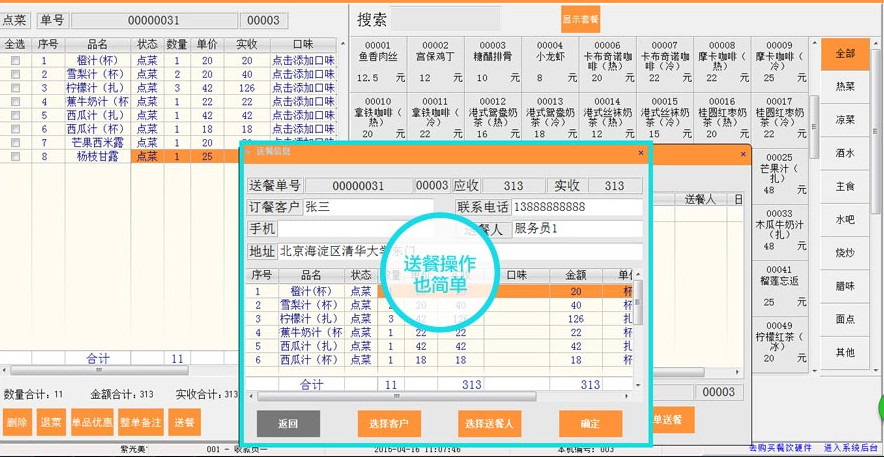 点击“外卖”可以看到外卖的功能相当的详细,点餐人,送餐人价格、以及详细的菜品等等