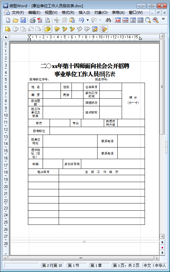 该事业单位工作人员报名表参考模板(二〇xx年第十四师面向社会公开招聘事业单位工作人员报名表)为doc格式word版,该表格共有两页,内容十分完整,表格项别也很全面,下文有该表格的预览图,如果你需要一份事业单位报名表模板作为参考的话,该事业单位工作人员报名表参考模板将会是你一个不错的选择哦!