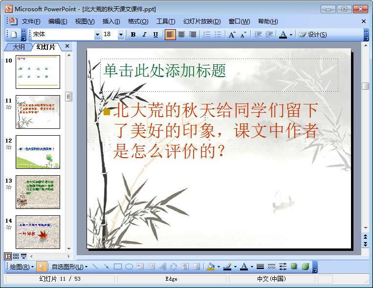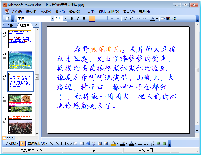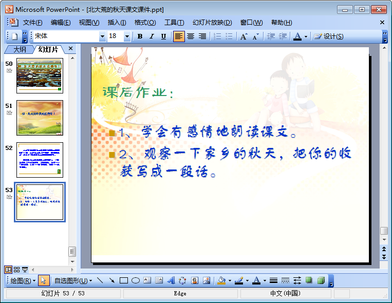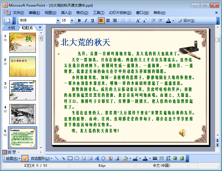 这是一份以ppt形式展现的北大荒的秋天课文课件,该ppt课件共有53页,是一份内容十分完整全面的优秀ppt课件。下文是该ppt课件的内容节选及预览图,如果你需要这份ppt课件的话,只需轻轻点击本文相应的下载地址进行下载即可!有需要的朋友们快来东坡下载吧!