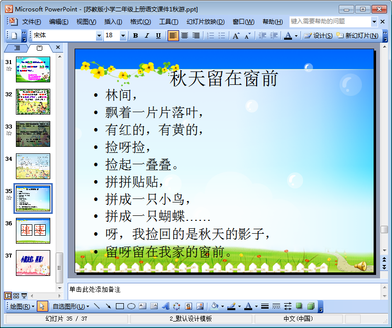 该苏教版二年级上册语文秋游ppt课件共由37页组成。想知道秋天到哪儿去游玩?想知道秋游都看些什么又玩些什么吗?——来吧!让这份秋游ppt教学课件告诉你吧!该ppt课件完全免费,有需要的朋友们可以放心下载!