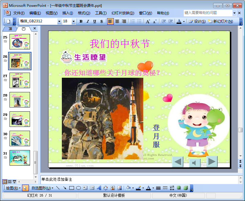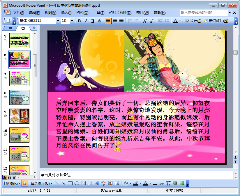这是一份适合小学一年级的学生学习和理解接受的关于中秋节的知识课件——内容免费、讲解详细、配图得当的适用于一年级学生使用的中秋节主题班会课件(以下简称为中秋节主题班会ppt),该中秋节主题班会ppt共31页,如果你需要这份一年级中秋节主题班会ppt课件的话,那就赶紧来东坡下载吧!