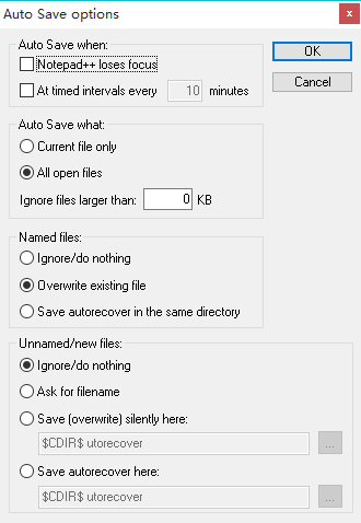 安装完毕后我们可以对 Auto Save 进行设置,点击「插件——Auto Save——Options」进入其设置界面。里面首先可以对自动保存的方式进行设置,你可以设置当 Notepad++ 失去焦点时进行自动保存,也可以设置特定的时间间隔进行自动保存。接着「Auto Save What」中可以选择是只保存当前正在编辑的文件还是所有打开了的文件都保存,还有忽略文件的大小设置。而下面两个设置项是当遇到已经有名字的文件和没有名字的文件时保存的操作,可以是忽略,也可是覆盖保存,而对于没有被命名的文件更可以设置一个路径去进行保存。