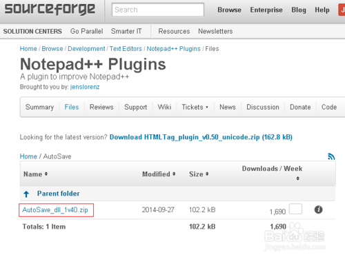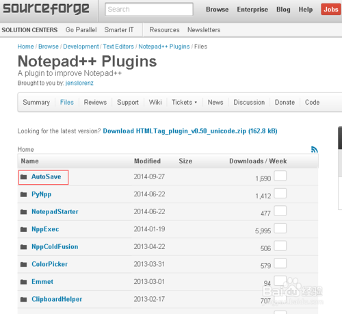 1、打开notepad++插件项目的官方网站:http://sourceforge.net/projects/npp-plugins/在列表中点击需要的插件(或在顶部搜索框搜索你想要的插件),以Autosave为例。