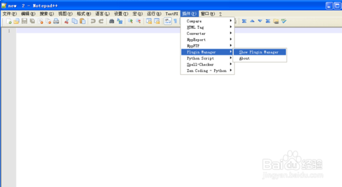1、启动notepad++,点击菜单“插件”-> “Plugin Manager” -> “Show Plugin Manager”即进入插件管理器