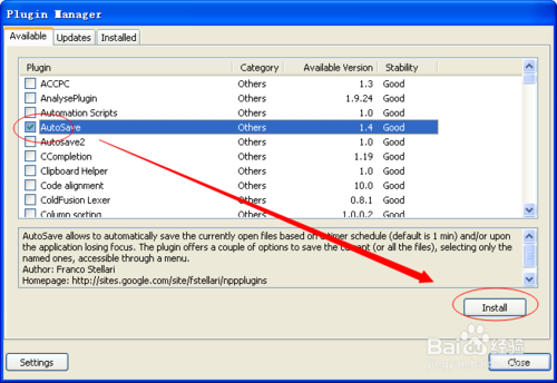 Auto Save 可以通过作者主页下载安装,也可以通过 Notepad++ 内置的插件管理器安装,点击「插件——Plugin Manager——Show Plugin Manager」打开插件管理器,然后选中 Auto Save 接着点击「Install」安装即可。