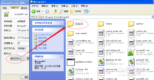 3、右击notepad++快捷方式图标,属性,查找目标,打开notepad++软件主目录,打开Plugins目录