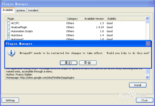 3、有的插件安装完需要重启notepad++,点击确定即可。点击完后如果notepad++没有自动启动,则自己手动运行就是。