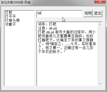 东北方言3000词是查询东北方言词汇的小工具。因词汇与普通话文字很难一一对应,所以提供拼音首字母或全拼查询方式,即输即得。