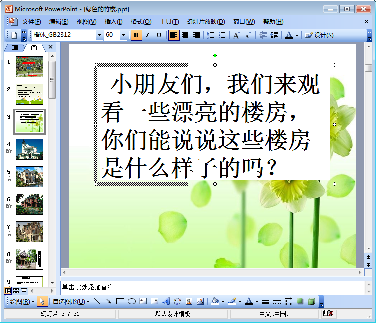 小朋友们,我们来观看一些漂亮的楼房,你们能说说这些楼房是什么样子的吗?