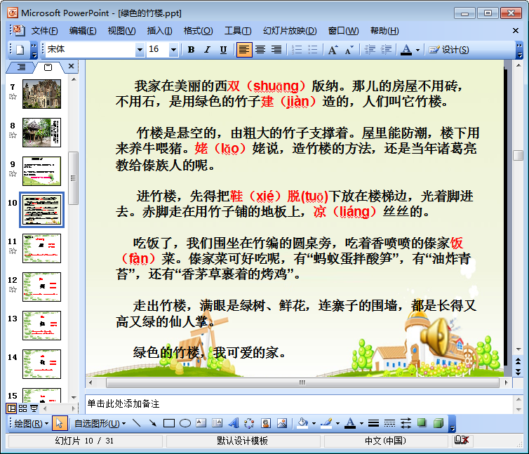 绿色的竹楼是湘教版二年级语文上册第一单元中的课文之一。本节内容小编为大家整理带来的是关于这篇课文的ppt课件,该ppt本着让学生会读、写七个一类字,会认九个二类字、能够正确、流利地朗读课文了解了解傣族人民的楼房与我们所住楼房的区别等教学要求设计,是一份设计十分用心的课件,欢迎有需要的朋友们前来东坡下载使用该绿色的竹楼ppt教学课件!