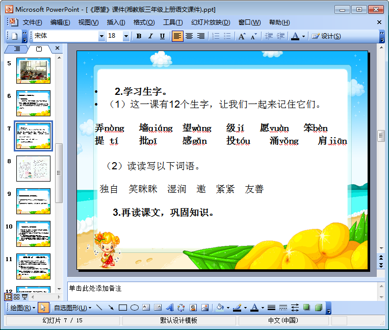 这是一份由15页组成的湘教版三年级上册语文课件之愿望ppt教学课件,这份ppt课件旨在让学生学会愿望一文中的12个生字并正确掌握生字的书写。另外该ppt课文在设计上也包含了让学生懂得同学如何友好待人,帮助学生树立良好的人际关系等内容,如果你需要这份愿望ppt教学课件的话,点击本文相应的下载地址进行下载即可!