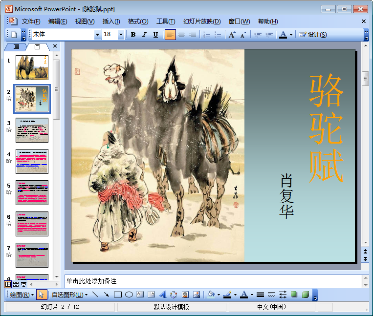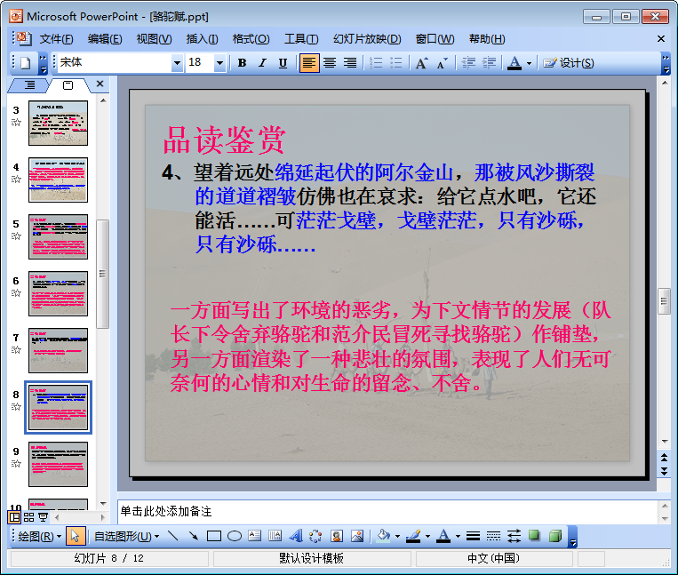 骆驼赋是作家肖复兴的代表作之一,它也是鄂教版九年级语文上册第一单元的第一篇课文,在本节内容中东坡小编为大家整理带来的是关于这篇课文的ppt课件,该课件共由12页组成,如果你需要这份骆驼赋课文教学课件的话,那就赶紧点击本文相应的下载地址进行下载吧!